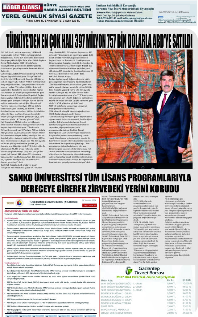 Güneydoğu Anadolu İhracatçıları Birliği (GAHİB) Başkanı Zeynal Abidin Kaplan Türkiye’deki halı üreticilerinin 2024 yılının ilk 6 ayında 183 ülke ve serbest bölgeye 283 milyon 792 bin metrekare halı ihraç ettiğini ifade etti. Gerçekleştirilen ihracatlar sonucu 1 milyar 374 milyon 655 bin dolar gelir sağlandığını da sözlerine ekleyen Başkan Kaplan Türk halıcılar, bir önceki yılın aynı dönemine göre ihracatını yüzde 7,6 artırdığını dile getirdi. Başkan Kaplan yaptığı değerlendirmede halı sektörünün en fazla geliri 1 milyar 85 milyon 417 bin dolarla makine halılarından elde ettiğini dile getirerek “Makine halılarını, 245 milyon 149 bin dolarla tufte halıları (özel tasarım), 39 milyon 735 bin dolarla el halıları ve 4 milyon 355 bin dolarla kilim takip etti. Diğer taraftan el halıları ihracatı bir önceki yılın aynı dönemine göre yüzde 28,1, tufte halıları da yüzde 14,1’lik artış gösterdi” dedi.
