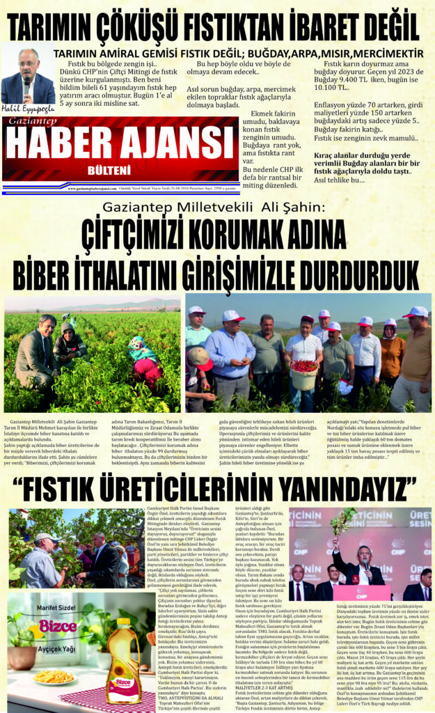Özel, çiftçilerin sorunlarının görmezden gelinmemesi gerektiğini ifade ederek, “Çiftçi yok sayılamaz, çiftlerin sorunları görmezden gelinemez. Çiftçinin sorunları yoktur diyorlar. Buradan Erdoğan ve Bahçe’liyi, diğer liderleri uyarıyorum. Sizin sahte gündemlerinizin peşine takılıp Antep fıstığı üreticilerini yalnız bırakmayacağım. Bizim derdimiz emekçidir, Rize’deki çaycı, Giresun’daki fındıkçı, Antep’teki fıstıkçıdır. Biz üreticimizin yanındayız. Emekçiyi sömürenlerle gidecek yolumuz, konuşacak konumuz, bir anayasa gündemimiz yok. Bizim yolumuz sizlersiniz, Antepli fıstık üreticileri, emekçilerdir. Cumhuriyet Halk Partisi diyor ki, “Üzülmeyin, enseyi karartmayın. Vardır bunun da bir çaresi. O da Cumhuriyet Halk Partisi’. Biz sizlerin yanındayız” diye konuştu.