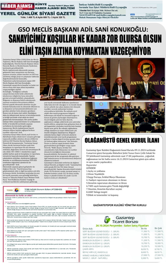 admin | 24 Ekim 2024 | e gazete Gaziantep haber ajansı Bülteni, Ekonomi, Genel, Gündem, Tüm Manşetler A- A+