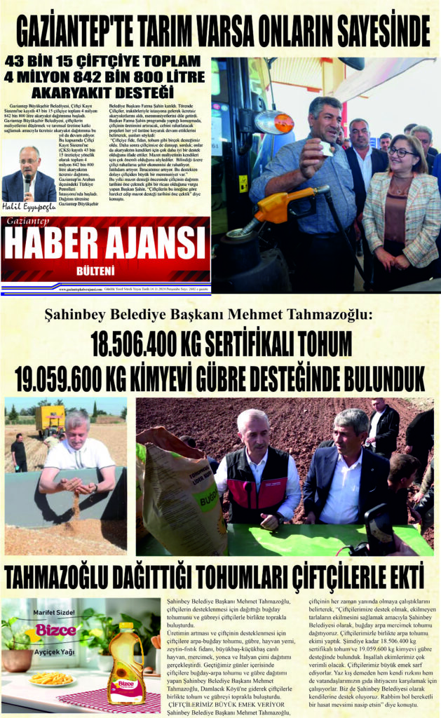 Şahinbey Belediye Başkanı Mehmet Tahmazoğlu, çiftçinin her zaman yanında olmaya çalıştıklarını belirterek, “Çiftçilerimize destek olmak, ekilmeyen tarlaların ekilmesini sağlamak amacıyla Şahinbey Belediyesi olarak, buğday arpa mercimek tohumu dağıtıyoruz. Çiftçilerimizle birlikte arpa tohumu ekimi yaptık. Şimdiye kadar 18.506.400 kg sertifikalı tohum ve 19.059.600 kg kimyevi gübre desteğinde bulunduk. İnşallah ekimlerimiz çok verimli olacak. Çiftçilerimiz büyük emek sarf ediyorlar. Yaz kış demeden hem kendi rızkını hem de vatandaşlarımızın gıda ihtiyacını karşılamak için çalışıyorlar. Biz de Şahinbey Belediyesi olarak kendilerine destek oluyoruz. Rabbim bol bereketli bir hasat mevsimi nasip etsin” diye konuştu.