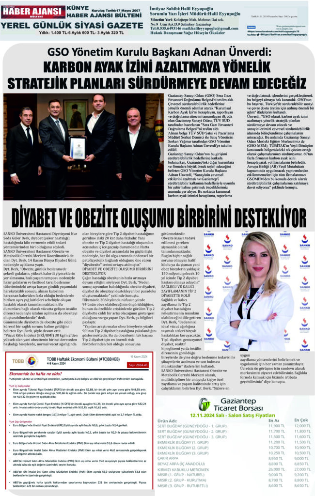 SANKO Üniversitesi Hastanesi Obezite ve Metabolik Cerrahi Merkezi Koordinatörü de olan Dyt. Berk, 14 Kasım Dünya Diyabet Günü nedeniyle açıklama yaptı.