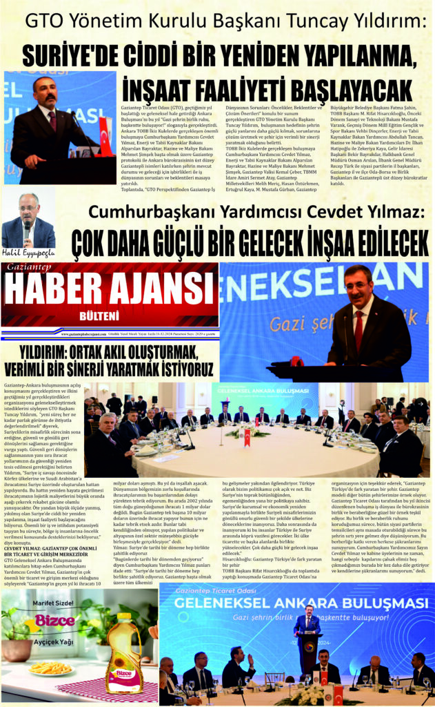 Gaziantep-Ankara buluşmasının açılış konuşmasını gerçekleştiren ve ilkini geçtiğimiz yıl gerçekleştirdikleri organizasyonu gelenekselleştirmek istediklerini söyleyen GTO Başkanı Tuncay Yıldırım,  “yeni süreç her ne kadar parlak görünse de ihtiyatla değerlendirilmeli” diyerek, Suriyelilerin misafirlik sürecinin sona erdiğine, güvenli ve gönüllü geri dönüşlerini sağlaması gerektiğine vurgu yaptı. Güvenli geri dönüşlerin sağlanmasının yanı sıra ihracat yollarımızın da güvenliği yeniden tesis edilmesi gerektiğini belirten Yıldırım, “Suriye iç savaşı öncesinde Körfez ülkelerine ve Suudi Arabistan’a ihracatımız Suriye üzerinde oluşturulan hattan yapılıyordu. Bu hattın yeniden hayata geçirilmesi ihracatçımızın lojistik maliyetlerini büyük oranda aşağı çekerek rekabet gücüne olumlu yansıyacaktır. Öte yandan büyük ölçüde yanmış, yıkılmış olan Suriye’de ciddi bir yeniden yapılanma, inşaat faaliyeti başlayacağını biliyoruz. Önemli bir iş ve istihdam potansiyeli taşıyan bu süreçte, bölge iş insanlarına öncelik verilmesi konusunda desteklerinizi bekliyoruz.” diye konuştu.