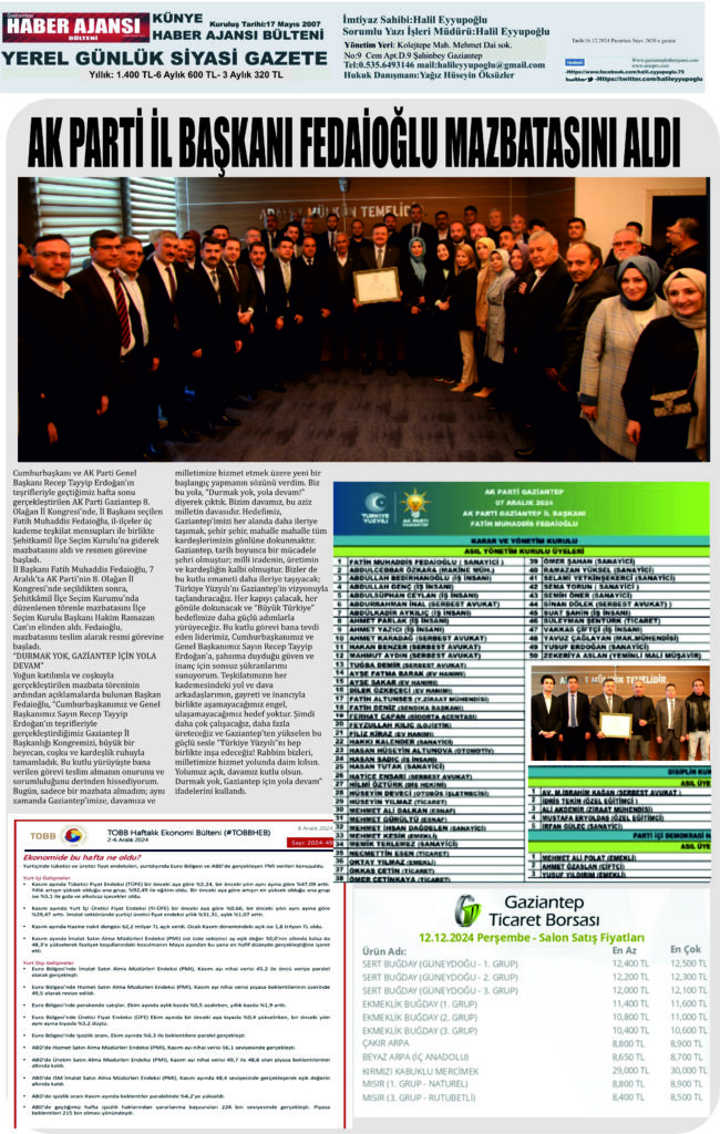 Gaziantep Haber Ajansı Bülteni Pazartesi 16.12.2024 e gazete