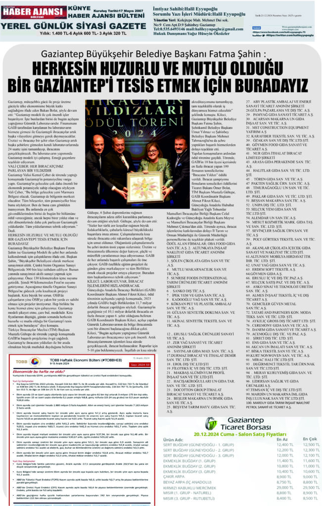 Gaziantep Haber Ajansı Bülteni Pazartesi 23.12.2024 e gazete