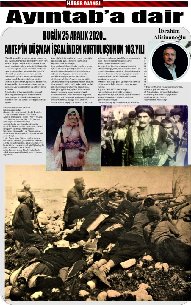 25 Aralık, Anteplilerin bayrağı, vatanı ve namusu için; İngiliz’e, Fransız’a ve işbirlikçi Ermenilere karşı aylarca; kanıyla, canıyla, malıyla; imanla, inatla, sabırla direnişinin zaferle taçlandığı kutlu gündür.