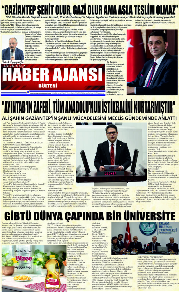 AK Parti Gaziantep Milletvekili Ali Şahin, 25 Aralık Gaziantep’in düşman işgalinden kurtuluşunun 103. yıl dönümü nedeniyle Türkiye Büyük Millet Meclisi’nde (TBMM) anlamlı bir konuşma yaptı. Gaziantep’in tarihi direnişinin ve kahramanlarının önemine dikkat çeken Şahin, meclis kürsüsünden şehrin bağımsızlık mücadelesini bir kez daha gündeme getirerek, Gaziantep’in kahraman evlatlarını ve tüm milleti selamladı.
