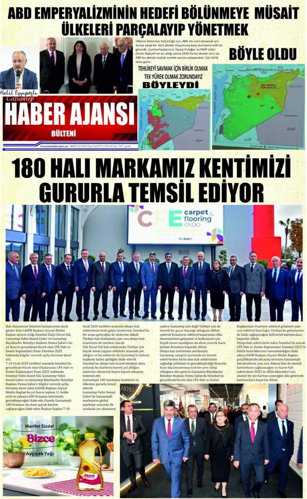 7-10 Ocak 2025 tarihleri arasında İstanbul’da gerçekleştirilecek olan Uluslararası CFE Halı ve Zemin Kaplamaları Fuarı 2025 hakkında İstanbul Valisi Davut Gül, Gaziantep Valisi Kemal Çeber ve Gaziantep Büyükşehir Belediye Başkanı Fatma Şahin’e bilgiler vererek açılış törenine davet eden GAHİB Başkanı Zeynal Abidin Kaplan bu yıl fuarın toplam 11 holde yerli ve yabancı 600 firmanın katılımıyla gerçekleşeceğini ifade etti. Fuarda Gaziantepli 180 firmanın da stant açarak katılım sağlayacağını ifade eden Başkan Kaplan 7-10 Ocak 2025 tarihleri arasında dünya halı sektörünün önde gelen isimlerinin İstanbul’da bir araya geleceğini de sözlerine ekledi.