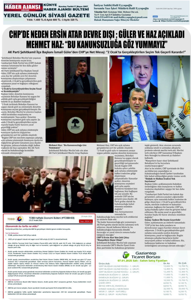 AK Parti Şehitkamil İlçe Başkanı İsmail Güler, CHP’nin açık oylama yöntemiyle yasa dışı bir şekilde yeni bir denetim komisyonu oluşturmaya çalışmasını eleştirerek, 2 Ocak’ta gerçekleştirilen gizli oylamanın yasal ve bağlayıcı olduğunu vurguladı.