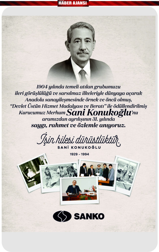 “İş hayatına ve gelecek kuşaklara örnek teşkil eden merhum Sani Konukoğlu’nun ‘İşin Hilesi Dürüstlüktür’ düsturuyla o dönemin koşullarında temelini attığı yatırımlar büyümeye, ülkemizin kalkınmasında önemli rol üstlenmeye ve insanımıza hizmet etmeye devam etmektedir. Merhum Sani Konukoğlu, sanayiciliği, hayırseverliği, eğitim ve sağlık alanında atmış olduğu adımlar ile herkesin takdirini toplamıştır. Bizler de kendilerinin yolunda yürümeye, en büyük miraslarından olan yenilikçi bakış açısı ile şehrimiz ve ülke sanayisini her alanda ileri taşımaya, insan odaklı çalışmaya devam edeceğiz. Vefatının 31’inci yıl dönümünde, şehrimiz ekonomisinin ve sanayisinin bugünlere ulaşmasında büyük emeği olan Kurucu Başkanımız merhum Sani Konukoğlu başta olmak üzere ebediyete irtihal eden tüm sanayicilerimizi saygı ve rahmetle anıyorum.”
