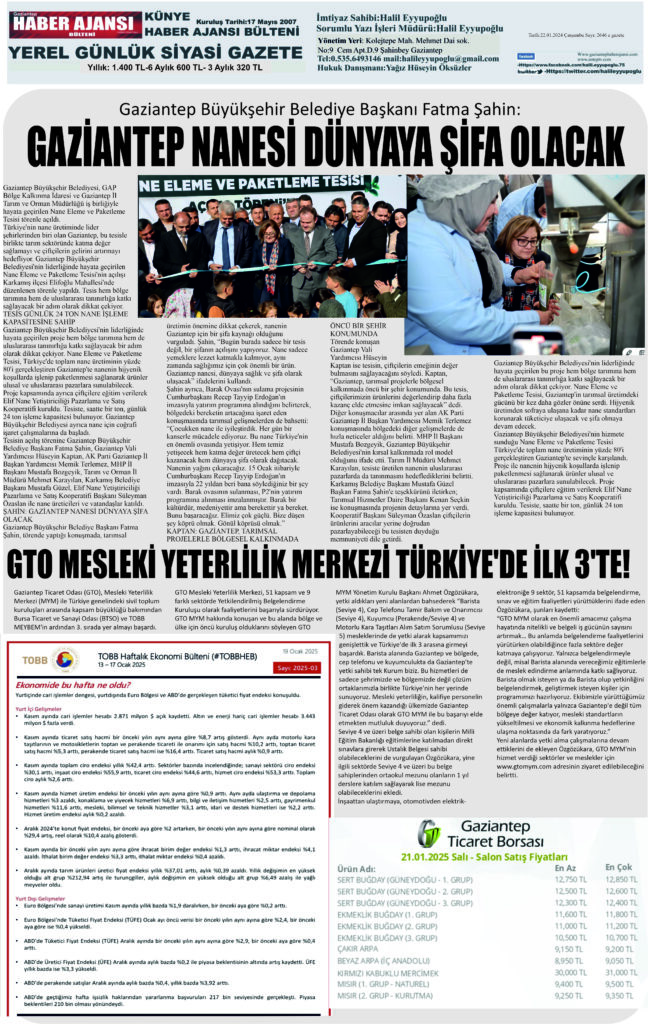 Gaziantep Haber Ajansı Bülteni Çarşamba 22.01.2024 e gazete