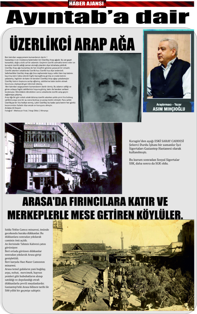 Gaziantep in en müstesna tiplerinden biri Üzerlikçi Arap ağadır. Bu zat gayet kanaatkâr, doğru sözlü saf bir adamdır. Geçimini üzerlik satmakla temin eder on kuruşluk üzerlik sattığı zaman ekmeği çıkardım diye istirahata çekilirdi.