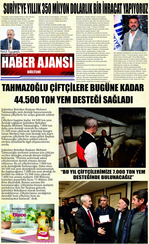 Şahinbey Belediye Başkanı Mehmet Tahmazoğlu üretimin artması için çiftçiye verilen desteğin artarak devam ettiğini belirterek, “Üretimi arttırmak adına çiftçilerimize destek olmaya devam ediyoruz. Bu yıl çiftçilerimize 7.000 ton yem desteğinde bulunacağız. Daha önce 44.500 ton yem desteğinde bulunmuştuk. Bu dağıtacağımız 7.000 ton yem desteği ile birlikte bu miktar 51.500 tona çıkacak. 7.000 ton yemin maliyeti 100 Milyonu bulurken pazarlıkla bunu 71 Milyon 500 Bine düşürdük. Bunun yarısını biz karşılayacağız. Çiftçimize bunun maliyeti neredeyse üçte bir fiyatına gelecek. Şahinbey Belediyesi olarak üretimi destekliyoruz. Çiftçilerimize verdiğimiz destekle hem çiftçimiz hem de vatandaşımız kanacak” dedi.