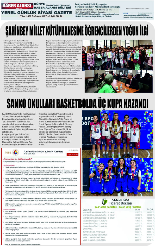 admin | 29 Ocak 2025 | e gazete Gaziantep haber ajansı Bülteni, Ekonomi, Genel, Gündem, Tüm Manşetler A- A+