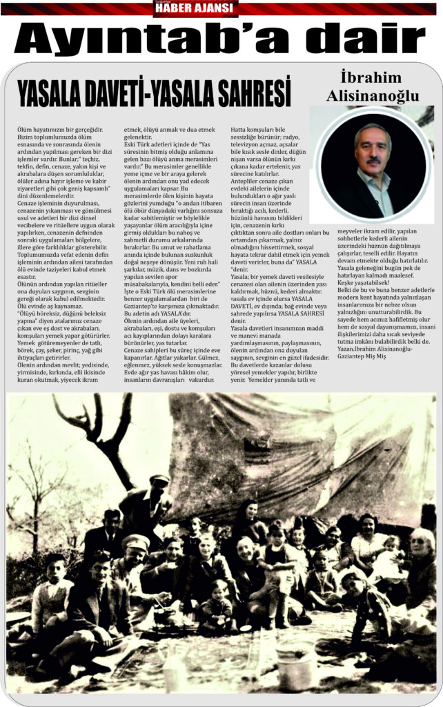 Belki de bu ve buna benzer adetlerle modern kent hayatında yalnızlaşan insanlarımıza bir nebze olsun yalnızlığını unutturabilirdik. Bu sayede hem acımız hafifletmiş olur hem de sosyal dayanışmamızı, insani ilişkilerimizi daha sıcak seviyede tutma imkânı bulabilirdik belki de.