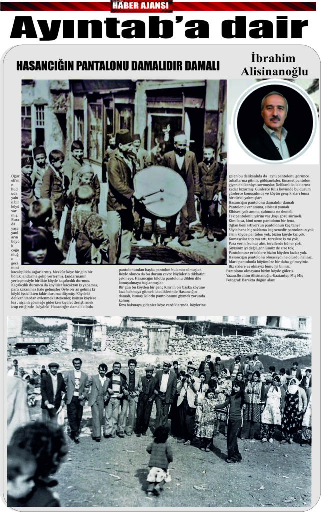 Bir gün bu köyden bir genç Kilis’in bir başka köyüne kıza bakmaya gitmek istediklerinde Hasancığın damalı, kumaş, kilotlu pantolonunu giymek zorunda kalmış.