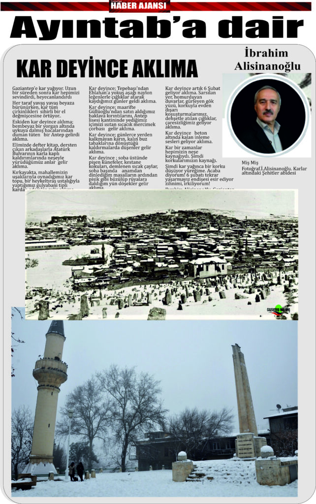 Eskiden kar deyince aklıma; bembeyaz bir yorgan altında uykuya dalmış bacalarından duman tüten   bir Antep gelirdi aklıma.