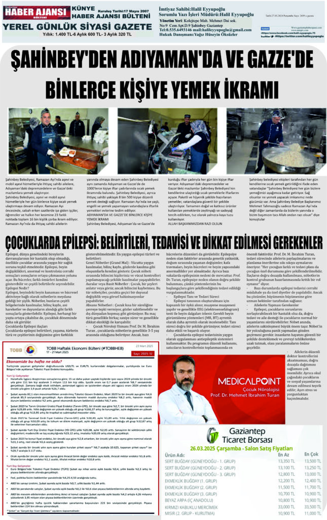 admin | 26 Mart 2025 | e gazete Gaziantep haber ajansı Bülteni, Ekonomi, Genel, Gündem, Tüm Manşetler A- A+