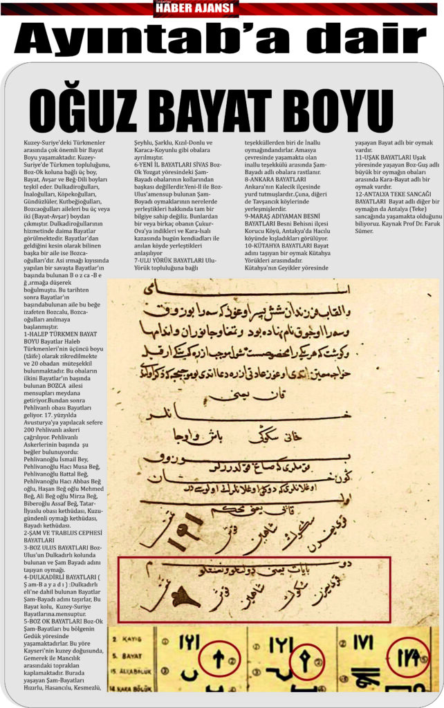 Kuzey-Suriye’deki Türkmenler arasında çok önemli bir Bayat Boyu yaşamaktadır. Kuzey-Suriye’de Türkmen topluluğunu, Boz-Ok koluna bağlı üç boy, Bayat, Avşar ve Beğ-Dili boyları teşkil eder. Dulkadiroğulları, İnaloğulları, Köpekoğulları, Gündüzlüler, Kutbeğioğulları, Bozcaoğulları aileleri bu üç veya iki (Bayat-Avşar) boydan çıkmıştır. Dulkadiroğullarının hizmetinde daima Bayatlar görülmektedir. Bayatlar’dan geldiğini kesin olarak bilinen başka bir aile ise Bozca-oğulları’dır. Asi ırmağı kıyısında yapılan bir savaşta Bayatlar’ın başında bulunan B o z ca -B e ğ ,ırmağa düşerek boğulmuştu. Bu tarihten sonra Bayatlar’ın başındabulunan aile bu beğe izafeten Bozcalu, Bozca-oğulları anılmaya başlanmıştır.