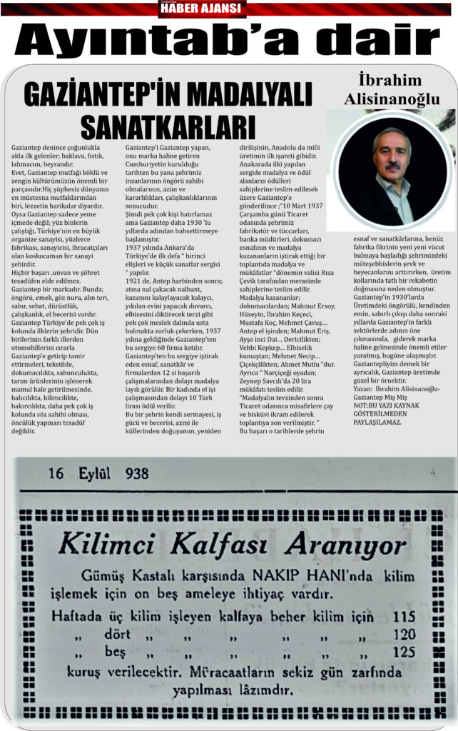 Anakarada ilki yapılan sergide madalya ve ödül alanların ödülleri sahiplerine teslim edilmek üzere Gaziantep’e gönderilince ;”10 Mart 1937 Çarşamba günü Ticaret odasında şehrimiz fabrikatör ve tüccarları, banka müdürleri, dokumacı esnafının ve madalya kazananların iştirak ettiği bir toplantıda madalya ve mükâfatlar “dönemin valisi Rıza Çevik tarafından merasimle sahiplerine teslim edilir.