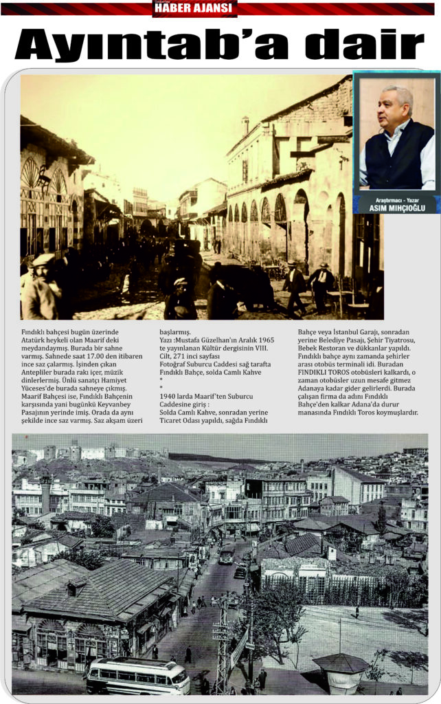 Fındıklı bahçesi bugün üzerinde Atatürk heykeli olan Maarif deki meydandaymış. Burada bir sahne varmış. Sahnede saat 17.00 den itibaren ince saz çalarmış. İşinden çıkan Antepliler burada rakı içer, müzik dinlerlermiş. Ünlü sanatçı Hamiyet Yüceses’de burada sahneye çıkmış. Maarif Bahçesi ise, Fındıklı Bahçenin karşısında yani bugünkü Keyvanbey Pasajının yerinde imiş. Orada da aynı şekilde ince saz varmış. Saz akşam üzeri başlarmış.