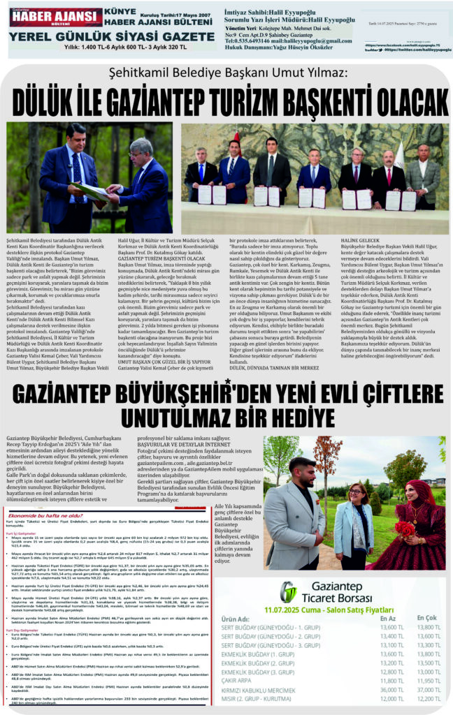Gaziantep Haber Ajansı Bülteni Pazartesi 14.07.2025 e gazete