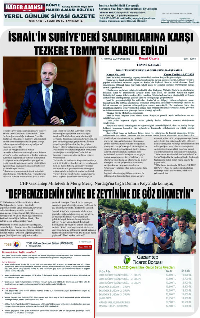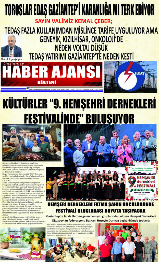 admin | 17 Temmuz 2025 | e gazete Gaziantep haber ajansı Bülteni, Ekonomi, Genel, Gündem, Kültür Sanat, Tüm Manşetler A- A+