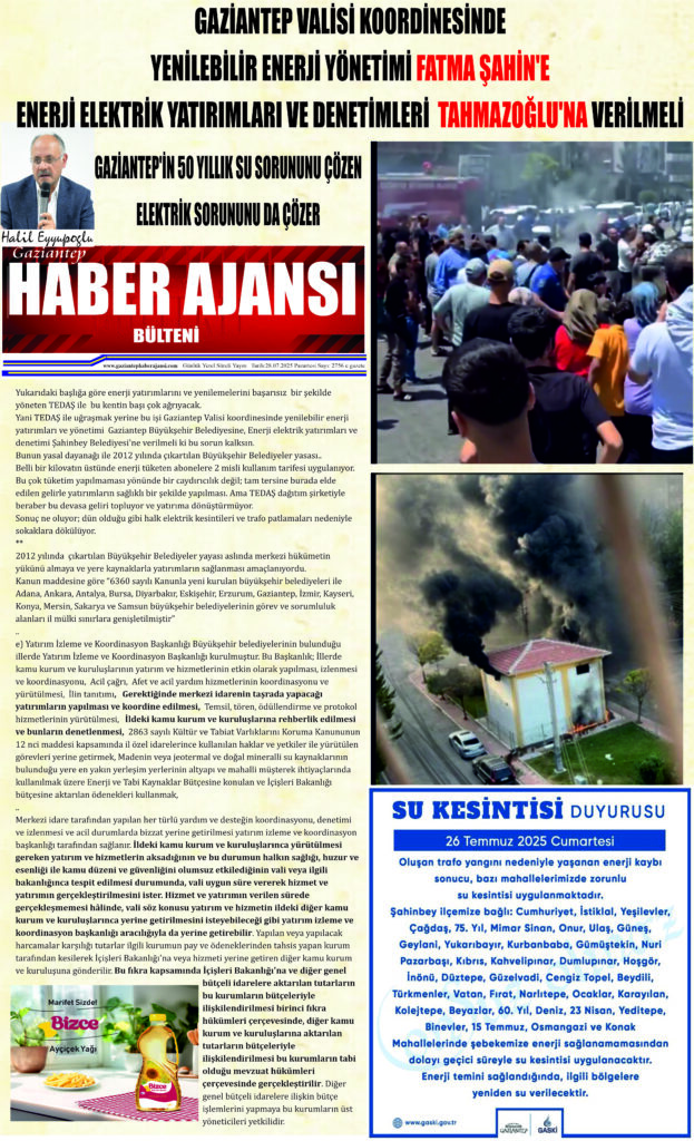 Yani TEDAŞ ile uğraşmak yerine bu işi Gaziantep Valisi koordinesinde yenilebilir enerji yatırımları ve yönetimi  Gaziantep Büyükşehir Belediyesine, Enerji elektrik yatırımları ve denetimi Şahinbey Belediyesi’ne verilmeli ki bu sorun kalksın.