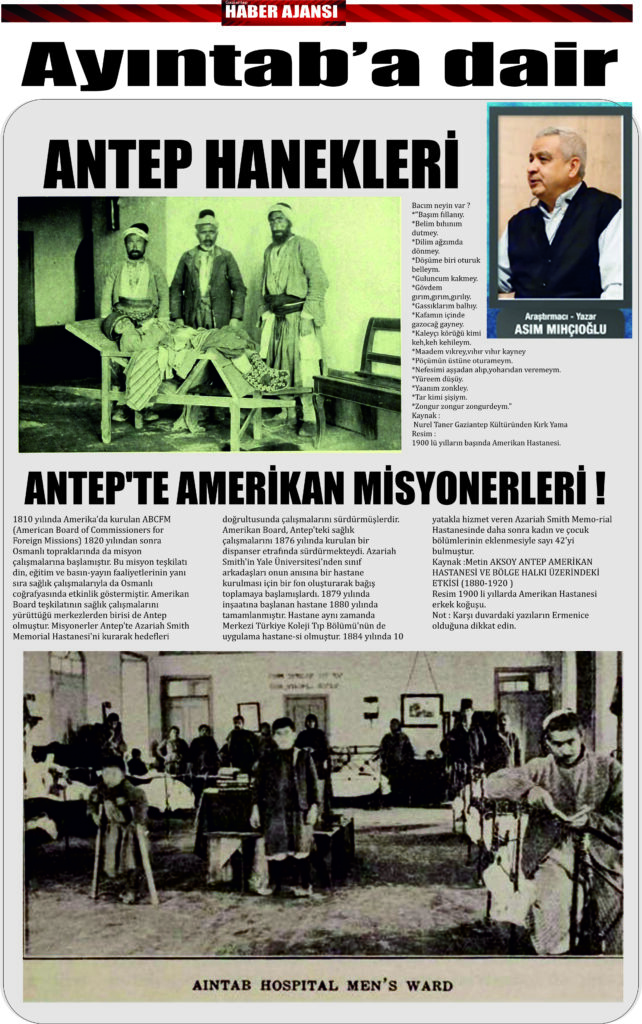 1810 yılında Amerika’da kurulan ABCFM (American Board of Commissioners for Foreign Missions) 1820 yılından sonra Osmanlı topraklarında da misyon çalışmalarına başlamıştır. Bu misyon teşkilatı din, eğitim ve basın-yayın faaliyetlerinin yanı sıra sağlık çalışmalarıyla da Osmanlı coğrafyasında etkinlik göstermiştir. Amerikan Board teşkilatının sağlık çalışmalarını yürüttüğü merkezlerden birisi de Antep olmuştur. Misyonerler Antep’te Azariah Smith Memorial Hastanesi’ni kurarak hedefleri doğrultusunda çalışmalarını sürdürmüşlerdir.