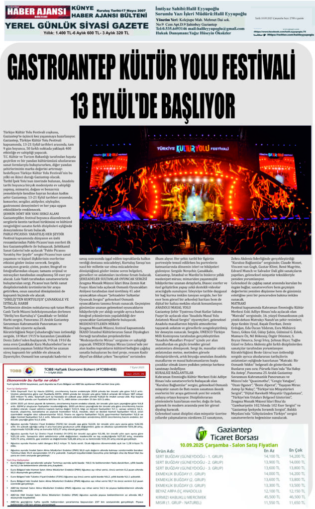 Gaziantep Haber Ajansı Bülteni Çarşamba 10.09.2025 e gazete