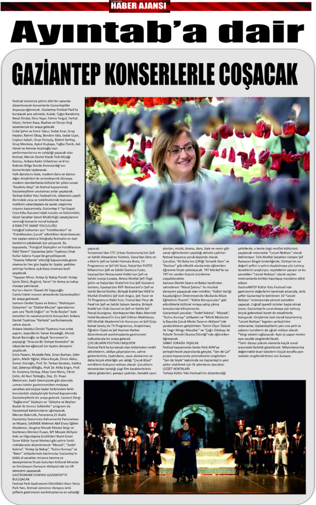 Tarihî İpek Yolu’nun üzerinde bulunan, Anadolu tarihi boyunca birçok medeniyete ev sahipliği yapmış, mimarisi, doğası ve benzersiz yemekleriyle kendine hayran bırakan kadim şehir Gaziantep; 13-21 Eylül tarihleri arasında; konserler, sergiler, atölyeler, söyleşiler, gastronomi deneyimleri ve her yaşa uygun etkinliklerle renklenecek.