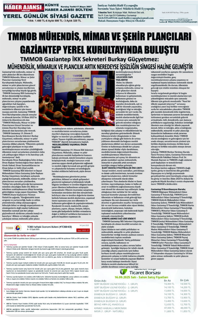 Gaziantep Haber Ajansı Bülteni Salı 16.09.2025 e gazete