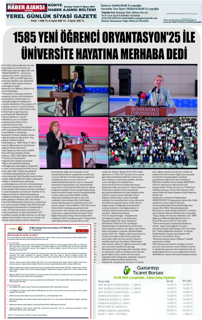 Hasan Kalyoncu Üniversitesi (HKÜ) Mütevelli Heyet Başkanı Haluk Kalyoncu, 2025-2026 Eğitim-Öğretim Yılı Açılışı ve Oryantasyon Programı’nda yaptığı konuşmada; “Bilgi ve deneyimlerle büyüyen yolculuğumuza başladığımız ilk günden bu yana, üniversitemizle birlikte birçok başarı elde ettik. Türkiye’nin girişimci ve yenilikçi kazanımlarıyla öne çıkan üniversitemizde Vakıf büyüklerimizin bizlere emanet ettiği disiplinli bir eğitim anlayışıyla, nitelikli ve erdemli insan yetiştirme sorumluluğumuzu özveriyle sürdürmekteyiz. Bu özverili çalışmalarımızın neticesi olarak Üniversitemiz, 500 dönüm açık hava yerleşkesi ile sayılı kampüsler arasında yer almakta ve bu bölgenin önemli bir ihtiyacını karşılayan, stratejik bir fonksiyon icra eden bir bilim kenti haline gelmiştir. Nitekim 2025 yılı Türkiye Üniversite Memnuniyet Araştırması sonuçlarına göre, üniversitemiz Türkiye’deki 200 üniversite arasında genel memnuniyet sıralamasında 5. sıraya, 74 vakıf üniversitesi arasında ise 3. sıraya yerleşmiştir ve daha da önemlisi %57 bursluluk oranıyla da öğrencilerine en çok burs sağlayan üniversiteler arasında yer almıştır. Bu nedenle üniversitemiz yalnızca akademik başarılarıyla değil, aynı zamanda sosyal sorumluluk projeleri, uygulamalı zorunlu staj ve proje ödevleri, bu hafta boyunca uygulanan oryantasyon dersi, çevreye duyarlı ve sürdürülebilirlik projeleri, yayın ve teknoloji üretimleri ile gençlerimiz için sürdürülebilir programlar vizyonuyla hareket eden bir eğitim anlayışına sahiptir. Güneş enerjisi kullanımıyla kendi enerjisini üreten çevreci kampüsümüzde on bine yakın yeni fidan dikildi, bisiklet yollarımız yenilenip artırıldı ve sıfır atık modeliyle üniversitemiz Sıfır Atık Belgesi almaya hak kazandı. Bu çalışmalarımızın bir sonucu olarak, UI GreenMetric 2024 En Çevreci Üniversiteler sıralamasına girmeye hak kazanmıştır. Yine uluslararası alanda yapılan araştırma ve değerlendirme kuruluşu Times Higher Education Dünya Üniversiteleri Etki Sıralaması 2024 sonuçlarına göre; Türkiye’deki vakıf üniversiteleri arasında 26’ncı, tüm üniversiteler arasında ise 74’üncü sırada yer almıştır. Bugün, 8 bin 500’e yakın öğrencisi ve 19 bin 421 mezunu ile her geçen gün daha da büyüyen köklü bir ailenin yeni üyesi oldunuz, aramıza hoş geldiniz. Bundan sonra atacağınız her adımda hem üniversitemizin hem de ülkemizin başarı hikâyesine katkı sunacaksınız. Hasan Kalyoncu Üniversitesi olarak, sizlerin hayallerini gerçekleştirebilmeniz için tüm imkânlarımızı seferber etmeye devam edeceğiz. Hasan Kalyoncu Üniversitesi, sizlere sunduğu imkânlar ile yeteneklerinizi ortaya çıkaracak, becerilerinizi geliştirmenize destek olacak, bugüne kadar olduğu gibi mezuniyetiniz sonrası da kariyer yolculuğunuzda iş ve istihdam alanlarınızda sizlerin yanında olacaktır” ifadelerini kullandı.