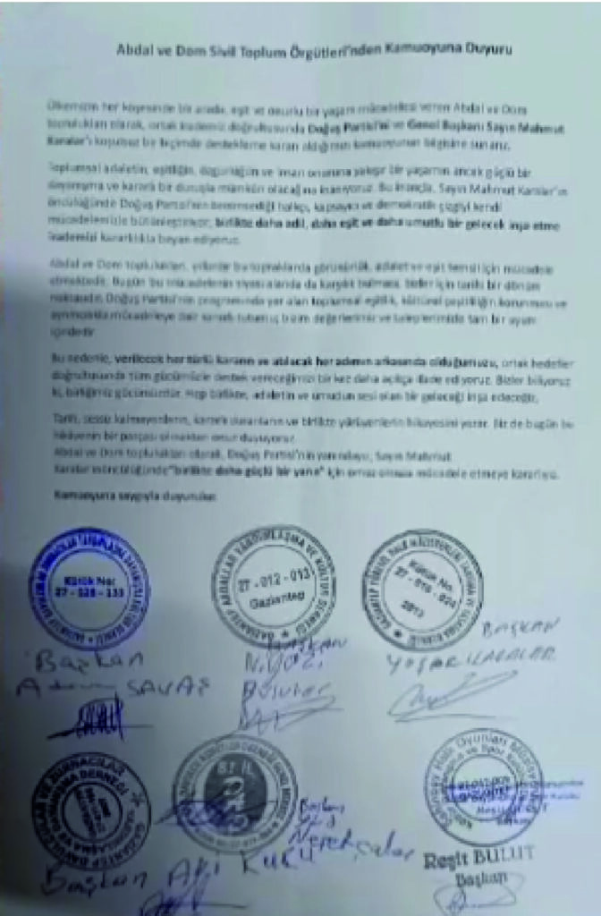 Türkiye’de Türkmen aşiretleri olarak bilinen Abdal aşiretlerinden oluşan Abdal ve Dom Sivil Toplum Örgütleri, yaptıkları ortak açıklamayla Doğuş Partisi ve Genel Başkanı Mahmut Karalar’a koşulsuz destek vereceklerini açıkladı.