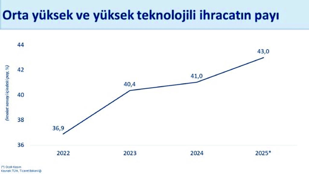 İhracatımızın teknoloji kompozisyonu iyileşti. Ocak-Kasım döneminde yüksek ve orta-yüksek teknolojili ürün ihracatı yıllık yüzde 9,6 arttı, bu grupların imalat sanayi ihracatındaki payı yüzde 43’e yükseldi.